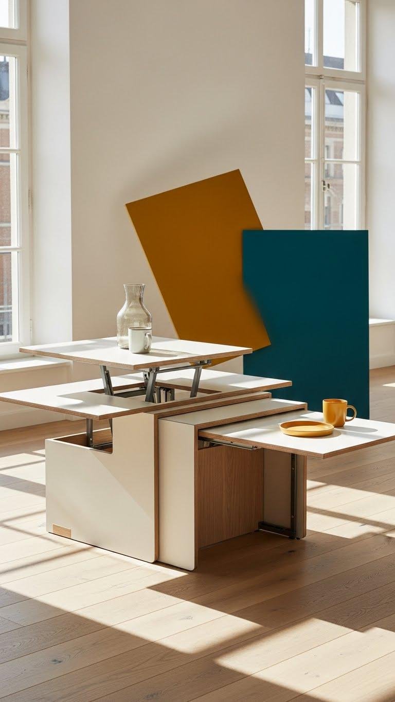 You can carry the same space-saving mindset from a fold-down wall bed into living and dining zones with nesting tables that expand into full dining surfaces.