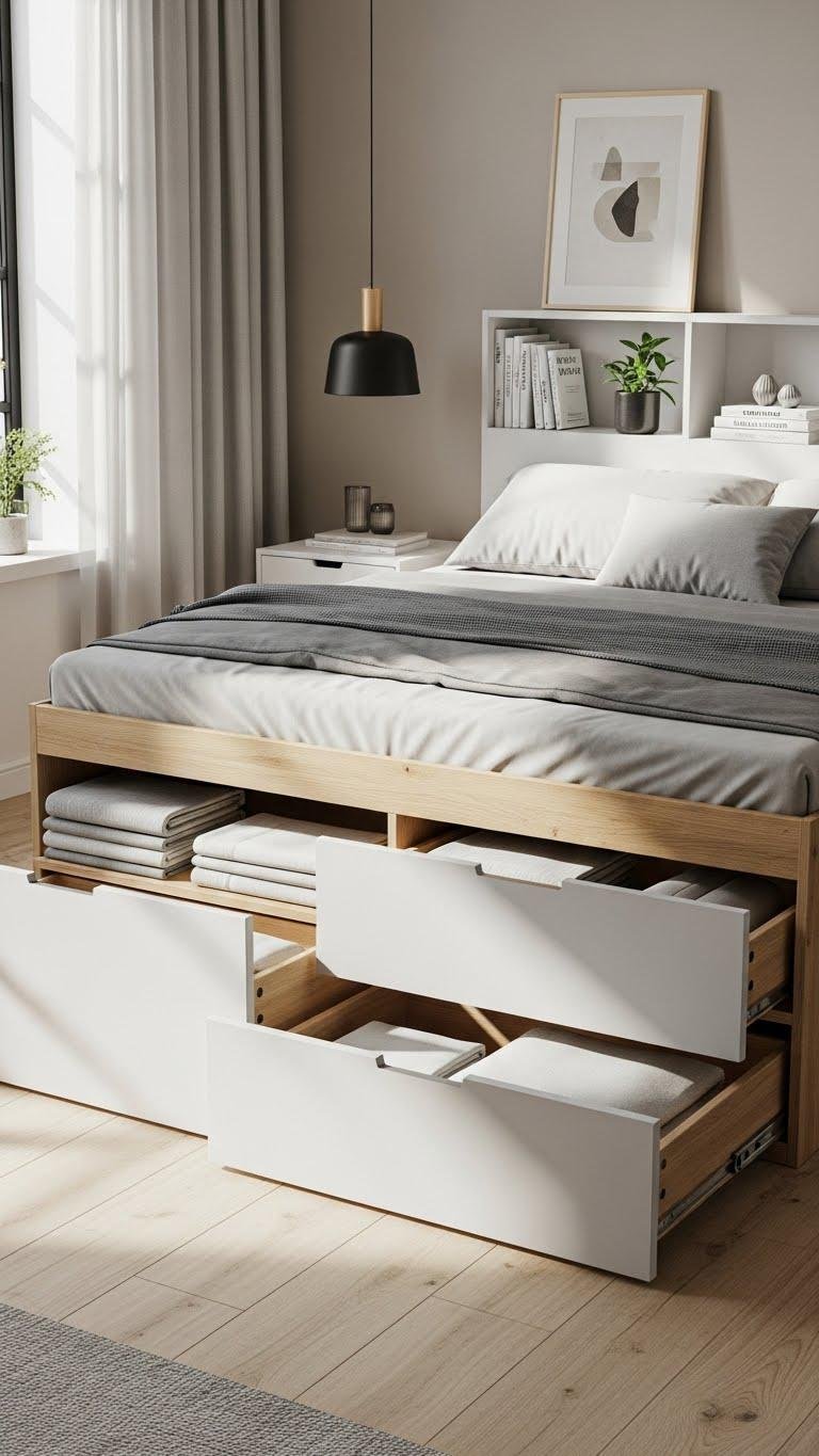 Platform-bed systems with built-in drawers and cubbies turn your sleeping area into a streamlined storage hub, so clutter disappears without sacrificing style. You’ll love under bed access and modular drawer systems that keep things hidden yet reachable. Choose recessed pulls and clean lines, add headboard storage for books or plants, and reclaim floor space so you move freely and live minimally.