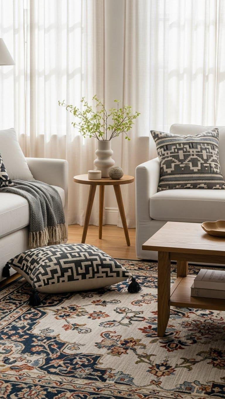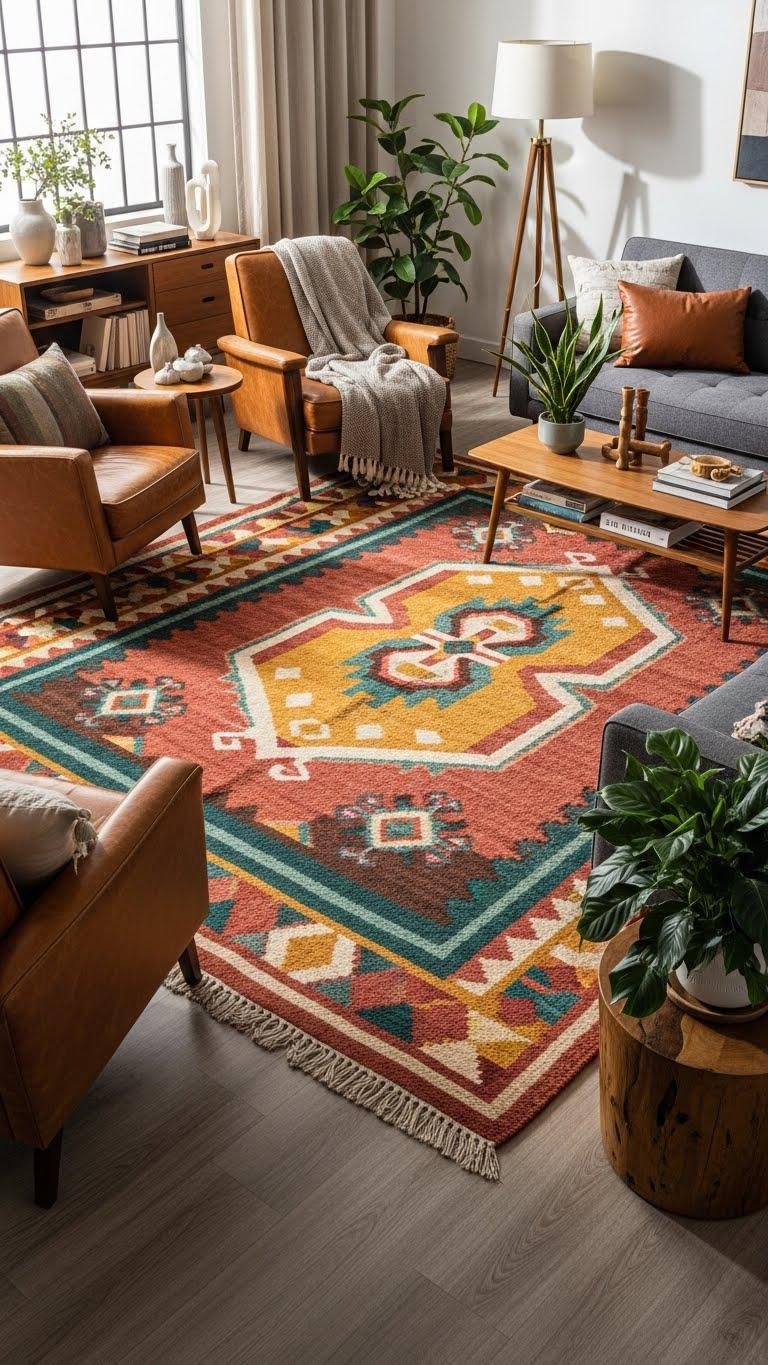 Placed at the heart of your seating area, a statement rug anchors the room and sets the tone, tying eclectic pieces together with color, pattern, and texture. Choose handwoven textures and bold geometric motifs to create contrast and cohesion; let the rug dictate palette and scale so you can mix vintage finds and modern accents confidently, giving your space freedom and a deliberate, grounded rhythm.