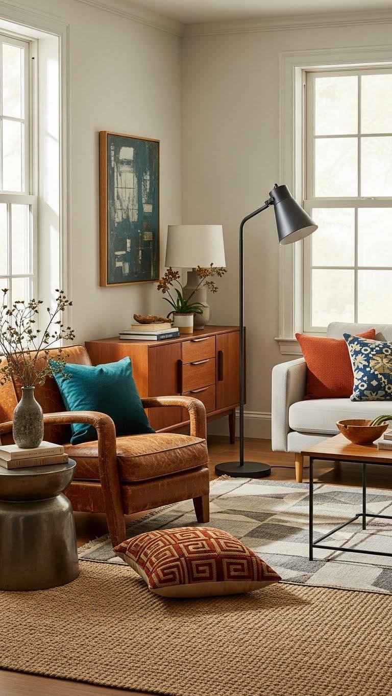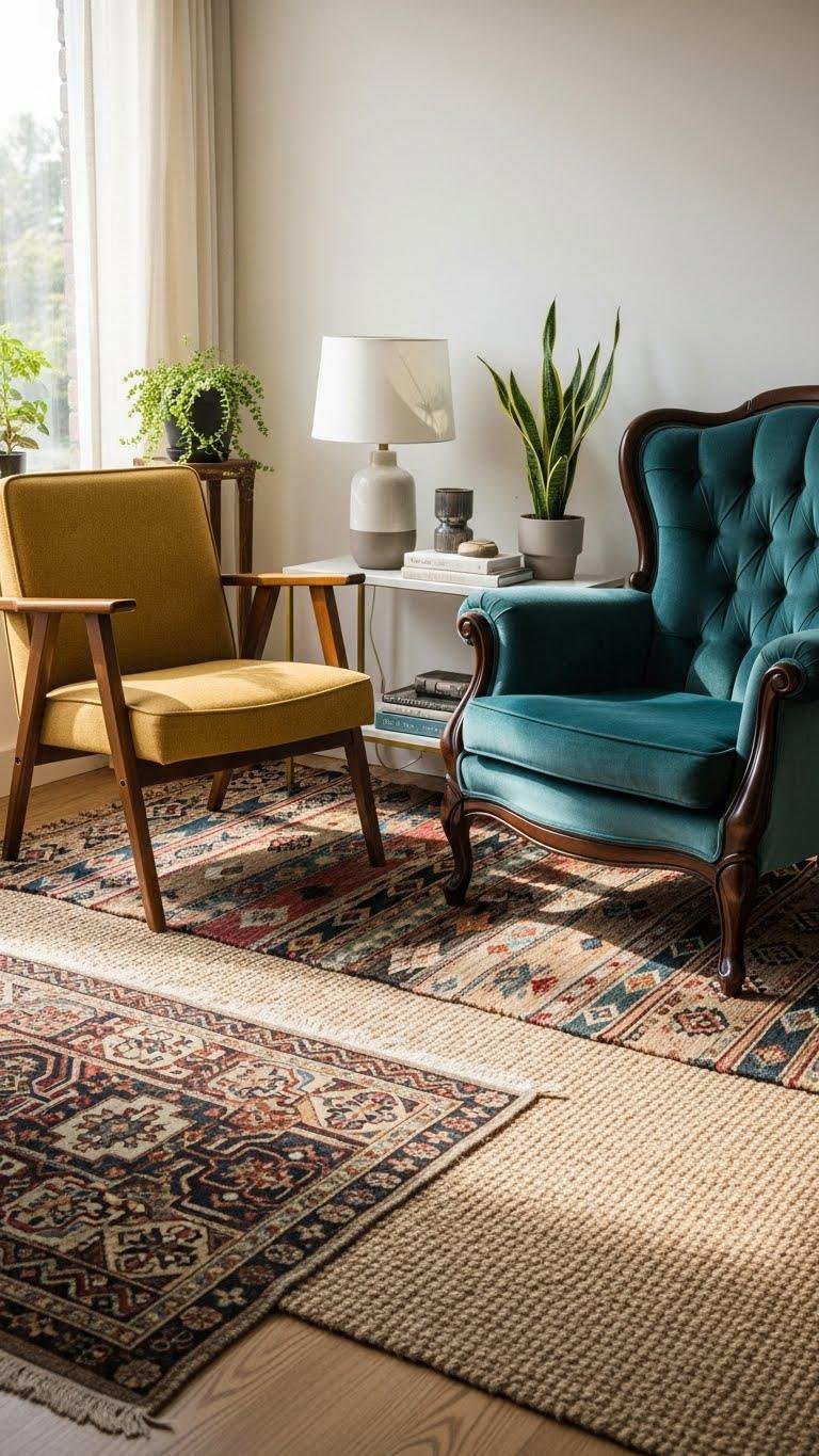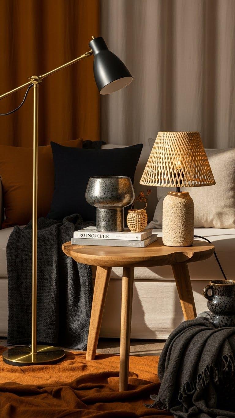 You’ll create asymmetrical vignettes that feel curated, not chaotic — pair a sculptural side table with mismatched lamps, mix metal with rattan, or contrast tall and low forms.