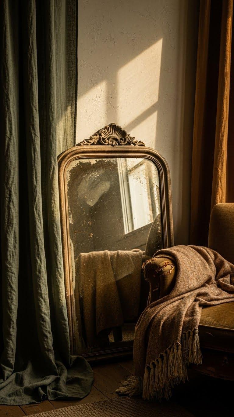 Pull an antique mirror into the room to instantly deepen the space and layer in character—its aged patina and irregular glass catch light differently than new mirrors, throwing soft, antique highlights across textiles and walls. You’ll love how an ornate frame anchors a vignette, offering layered reflections and patina charm; antique glass lends soulful imperfections that free your décor from perfection.