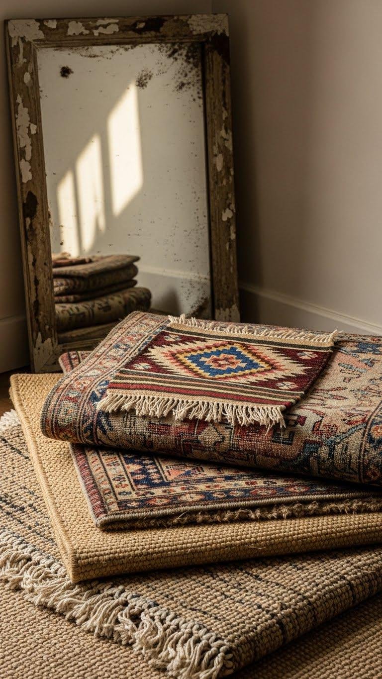 When you lean an antique mirror into a corner to add depth and patina, bring that same layered attention to the floor by stacking rugs that mix scale, texture, and history.