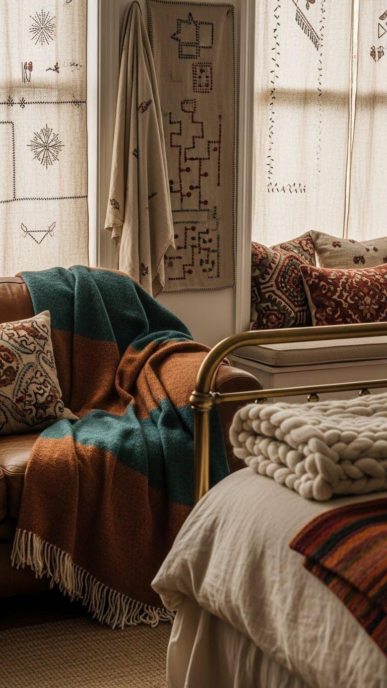 You’ll mix handwoven curtains with stitchwork wallhangings, tactile throws, and vintage linens to create free, lived-in chic.