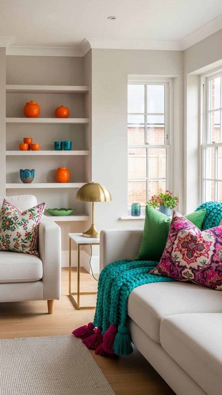 Brighten a neutral scheme by slipping in unexpected pops of color with accessories that feel deliberate, not accidental. Let your choices sing: place vibrant tassels on throws and lamps, tuck citrus ceramics on shelves, and layer bold pillows that refuse to blend in. You’ll create a playful, curated look that honors freedom, balance, and confident, joyful contrast without overwhelming the space.