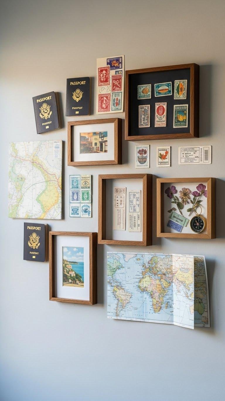A handful of curated mementos can turn a blank wall into a personal travel gallery that tells your story at a glance. You’ll mix passport mementos, postcards and small prints with maps, frames and souvenir shadowboxes to create rhythm and contrast.