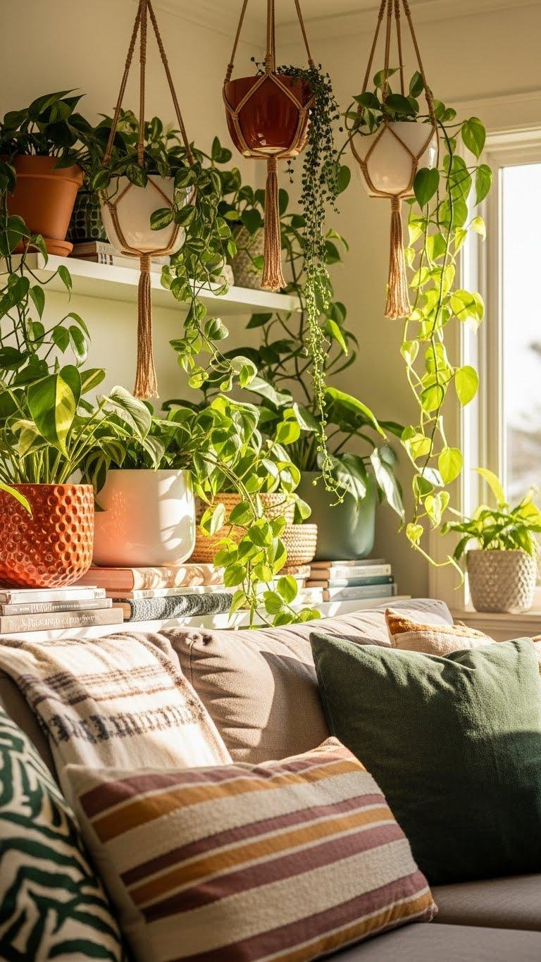 After you’ve introduced lively accessories, bring living greenery into the mix to soften edges and visually link disparate pieces. You’ll use hanging planters to add height and sculptural interest, while trailing vines drape over shelves and sofas, uniting styles without rules. Choose varied leaf shapes and textured pots to create rhythm, freedom, and a cohesive, breathable space that feels unapologetically yours.