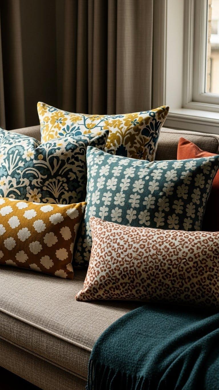 Mix patterned pillows in different scales to give your seating instant depth and personality — layer a large-scale floral or geometric as the anchor, add medium-scale motifs for progression, and finish with small-scale or tonal patterns to provide detail without competing.