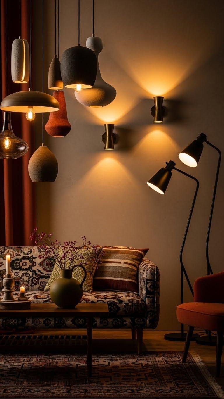 Once your sofa tells a layered, patterned story, let lighting become the next unmistakable chapter: choose one-of-a-kind fixtures that act like functional sculptures, casting flattering pools of light while anchoring the room’s personality.