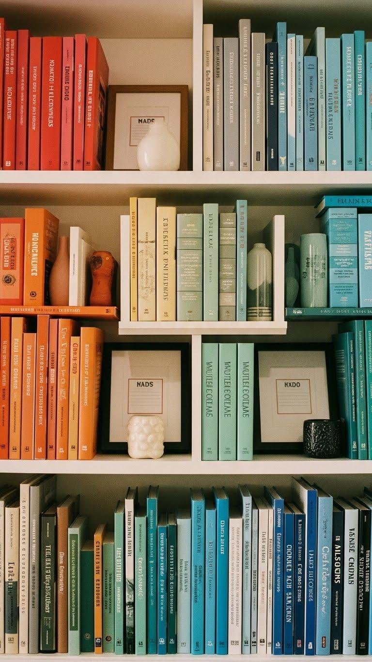 Let your bookshelf tell two stories at once—one of color and one of content—so every spine feels deliberate. You’ll arrange volumes by color gradation, then refine sections by theme so visual flow meets intellectual intent. Mix bold hues with muted tones, alternate heights, and use narrative sequencing to guide readers through moods. The result feels free, curated, and unmistakably yours.