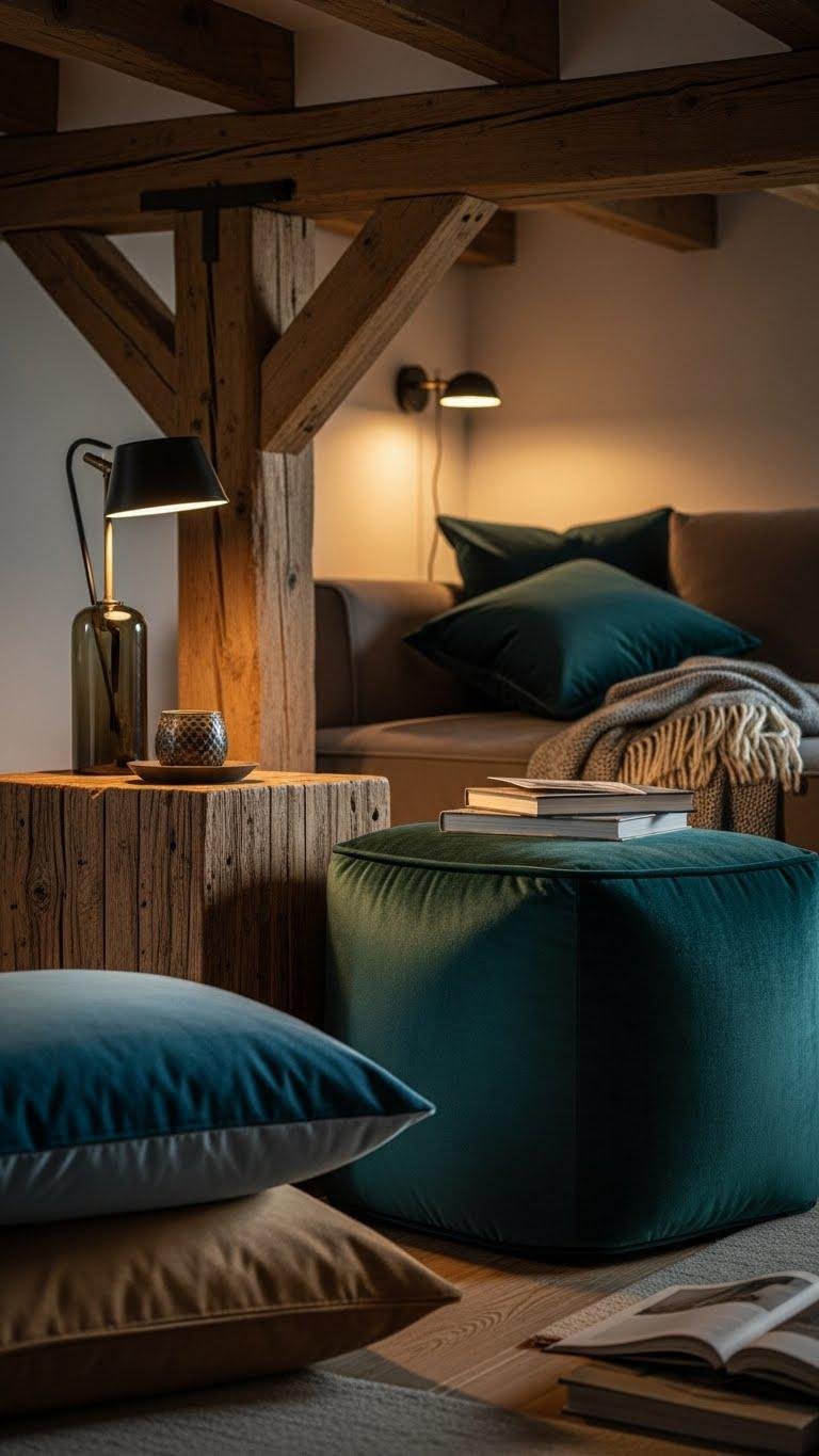While velvet brings plush, luminous depth to seating and pillows, rustic wood introduces tactile, timeworn warmth that keeps the room grounded. You’ll balance luxe and lived-in by pairing a jewel-toned velvet pouf with rough-hewn tables or reclaimed beams overhead. Mix finishes sparingly, let textures sing, and choose pieces that invite lounging and movement so your space feels liberated, layered, and utterly personal.