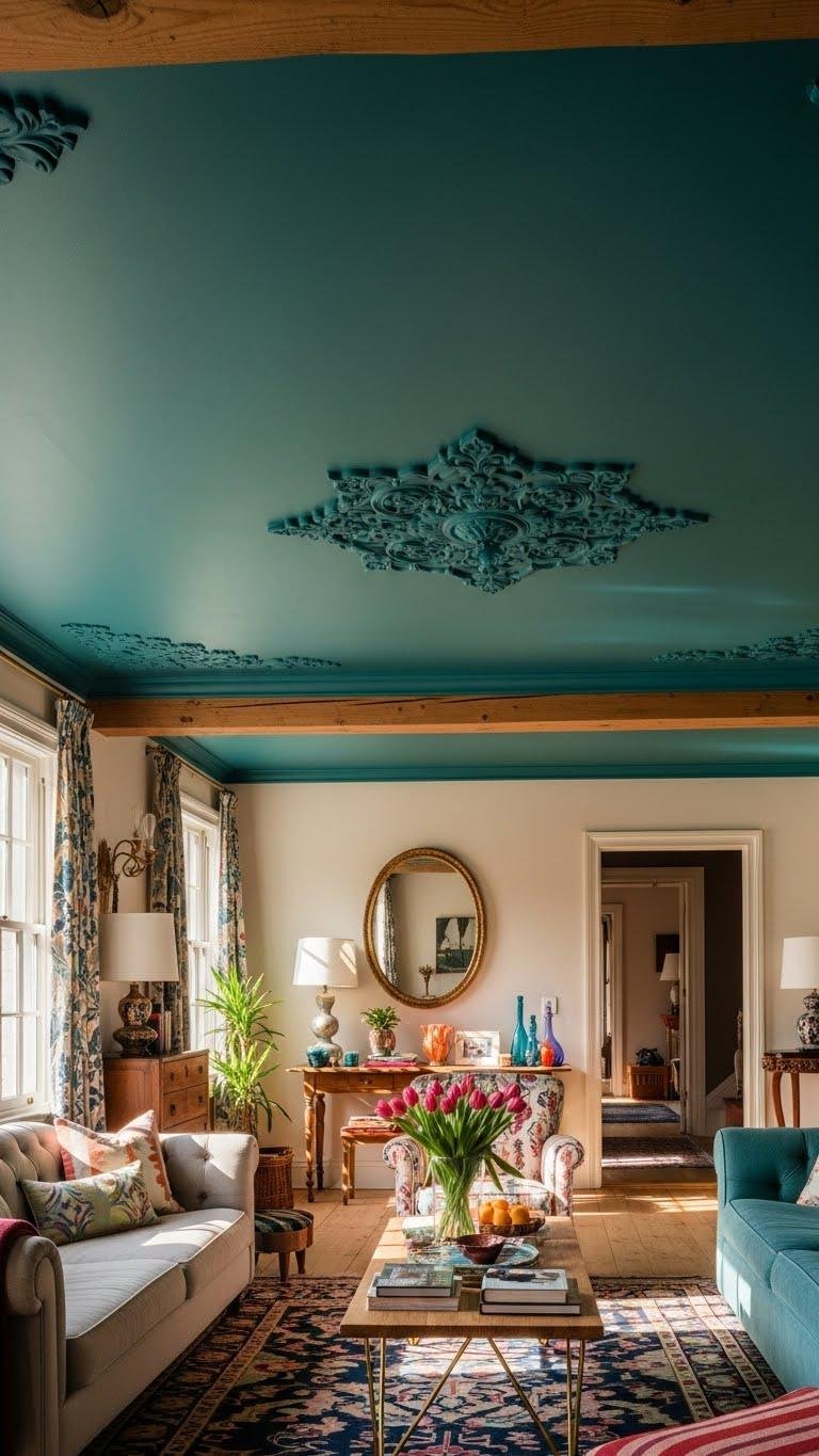 Why not lift the room’s personality by painting the ceiling an unexpected color? You can choose moody teal to deepen space, making walls recede and furnishings pop.