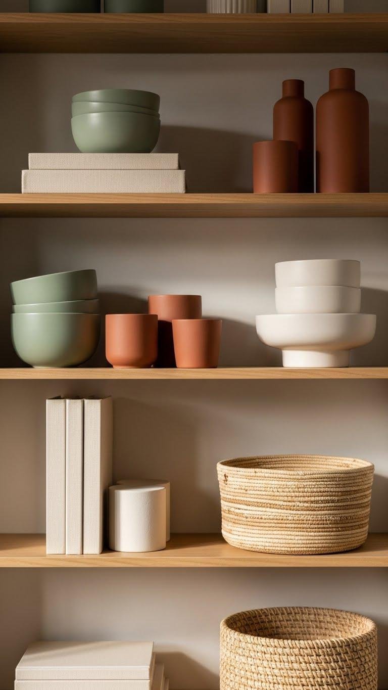 Lean into a focused color story to make open shelves feel intentional rather than cluttered; pick two or three coordinating hues and let them recur in books, ceramics, and small decor to create rhythm and balance.