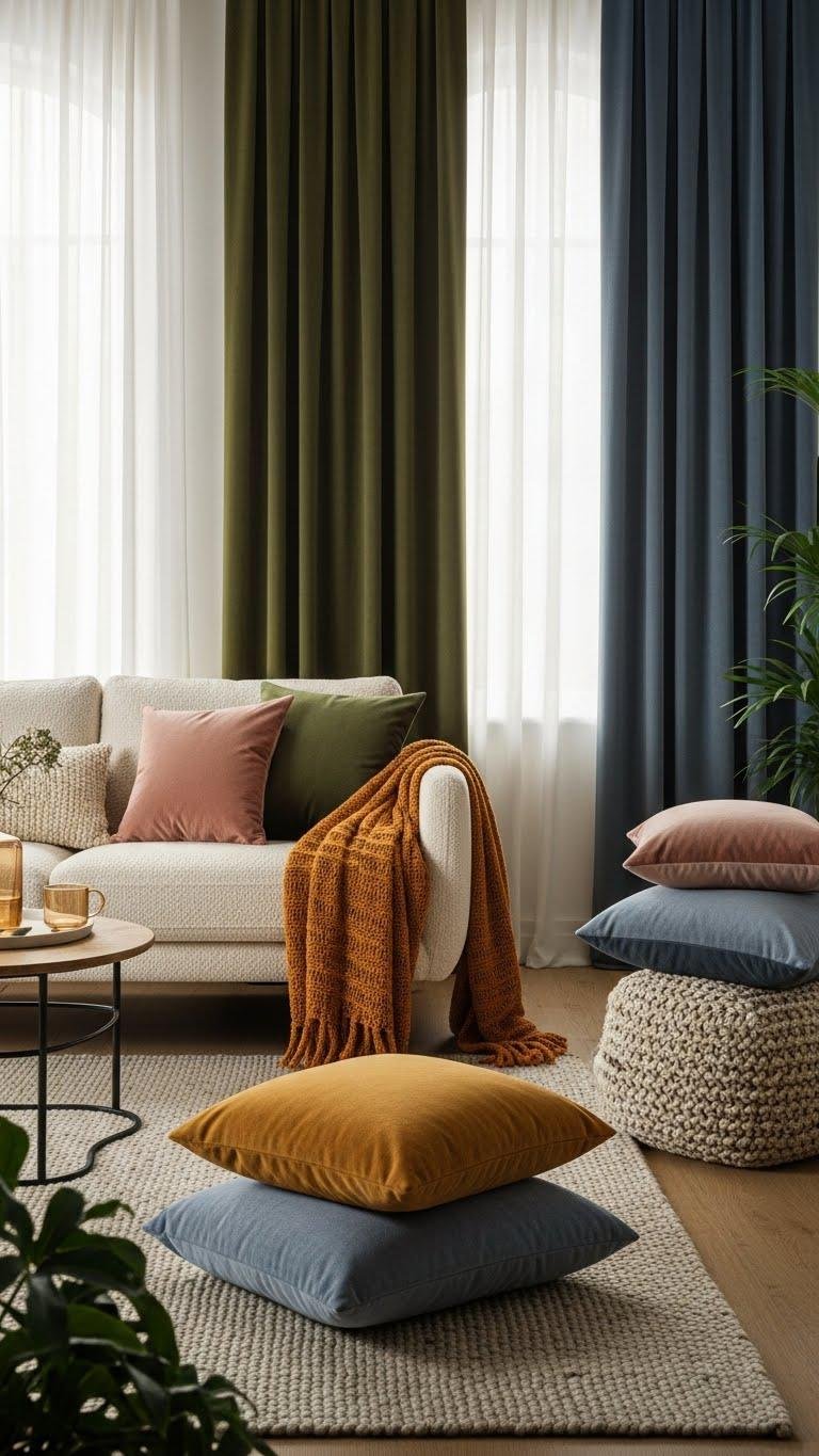 You’ll balance bouclé upholstery on seating with plush velvet drapery at windows, adding cushions and throws in complementary hues.