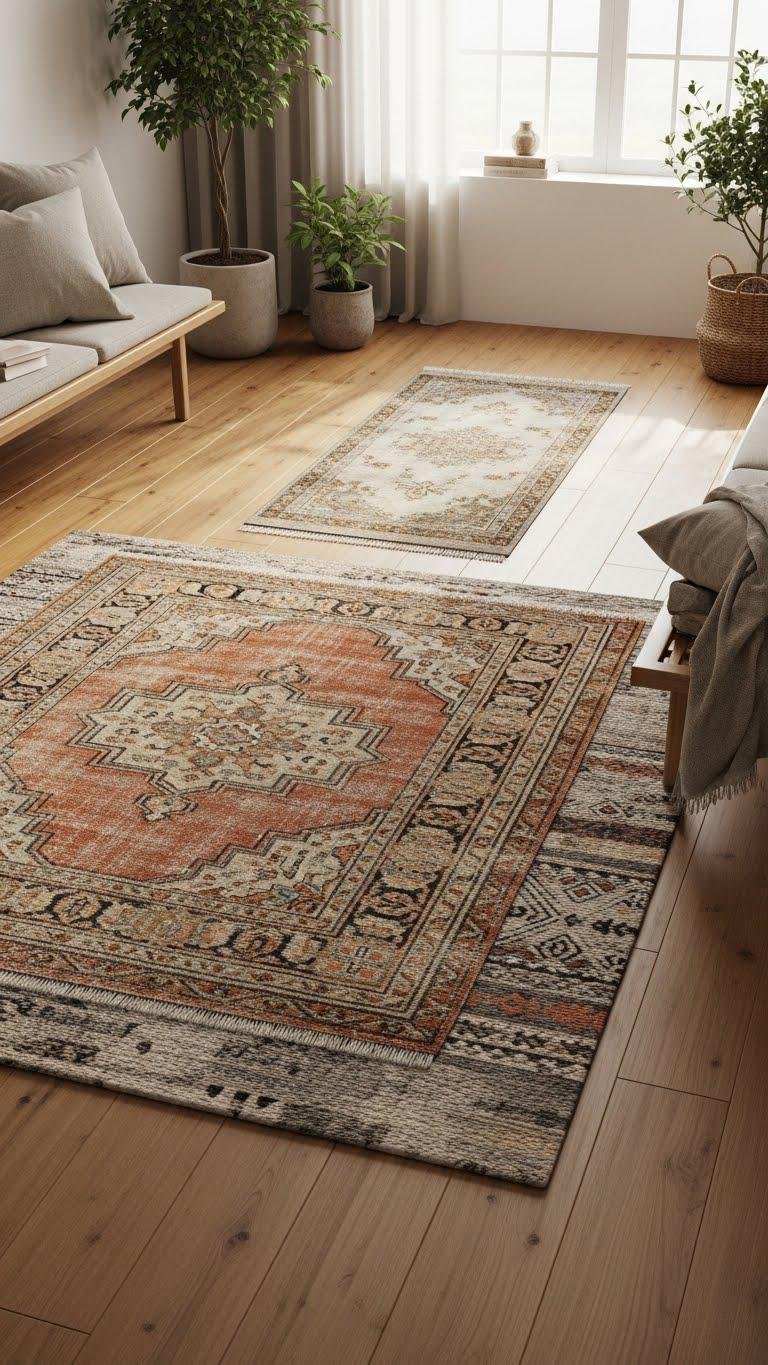 Anchor your hardwood floors with layered vintage rugs to add warmth, pattern, and a lived-in polish without overwhelming a Japandi palette.