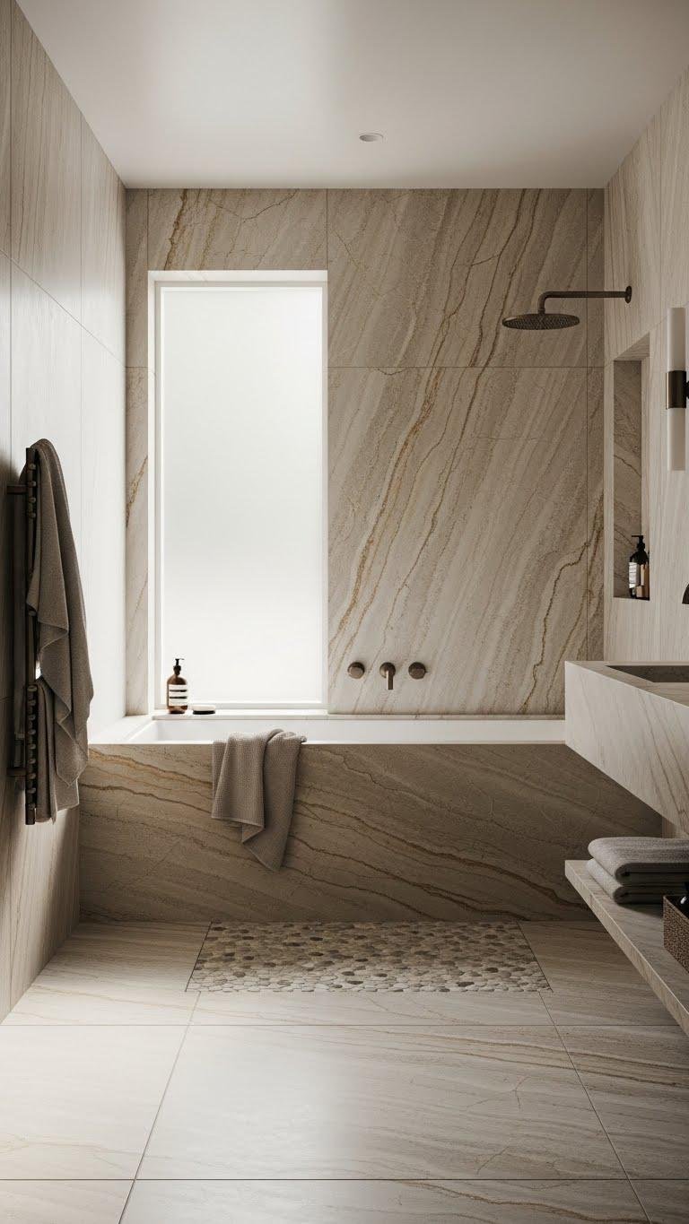 When you swap glossy tile for honed stone and warm veining, your bathroom instantly feels calmer and more intentional—spa-like without feeling staged. Choose oversized slabs, matte finishes, and simple brass fittings to keep the look timeless.