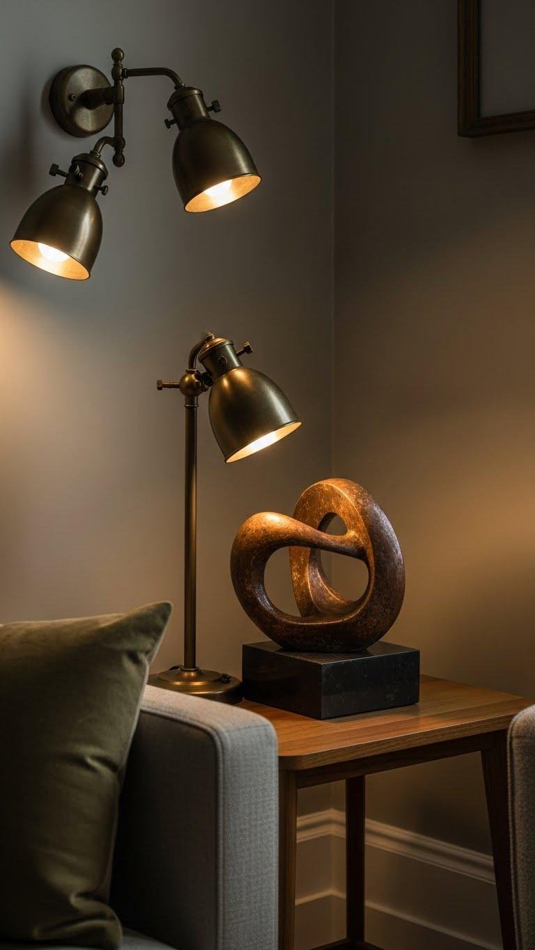 You’ll layer antique brass fixtures, oxidized sculptures and lighting that catch a subtle sheen.