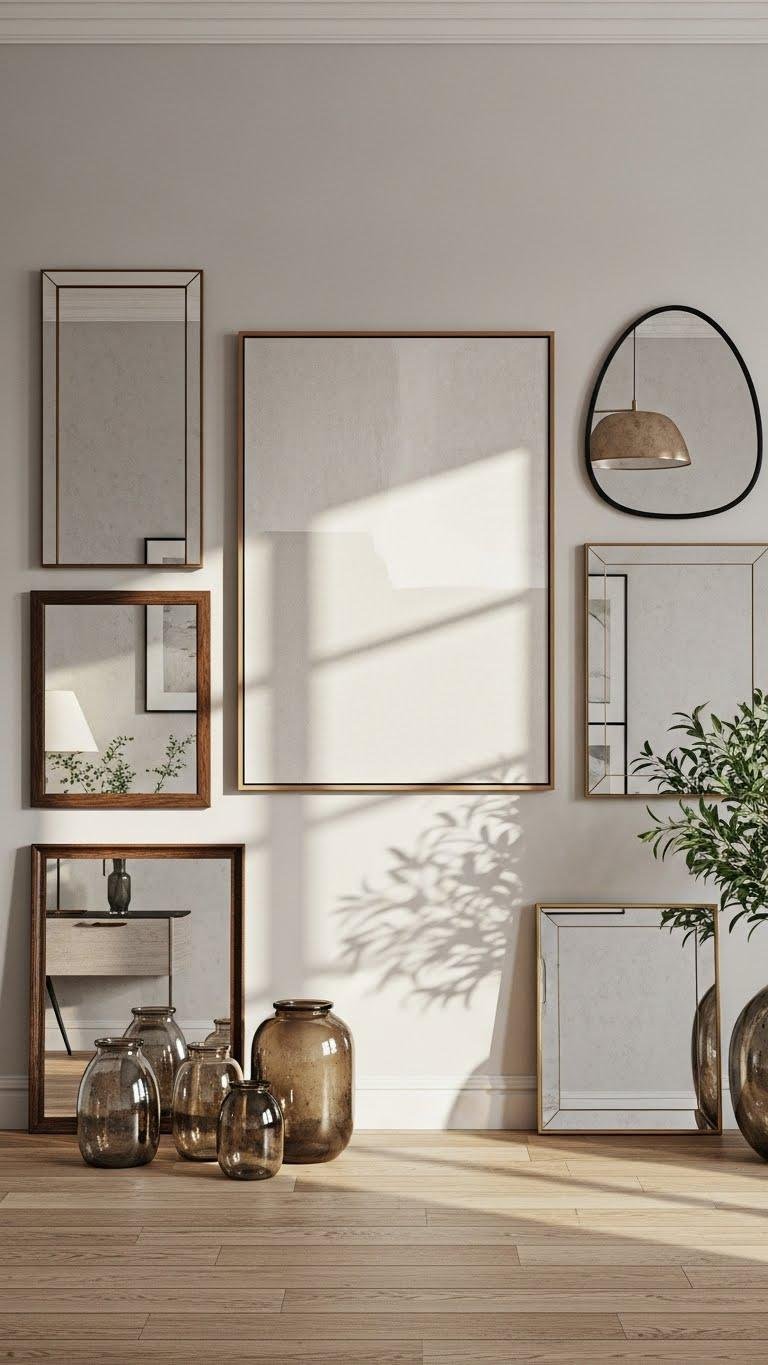 Mix aged glass and polished metals for texture, keep compositions intentional, and let reflections free the space without clutter—clean, curated, and effortlessly modern.