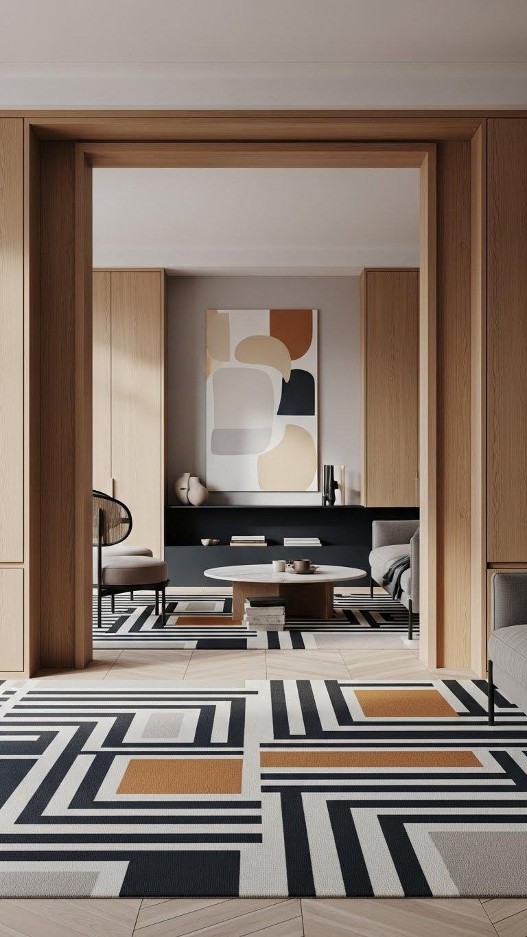 Choose rugs or wallpaper that show geometric restraint and patterned symmetry to anchor the room. You’ll balance daring motifs with muted palettes, letting shapes define movement while preserving calm.