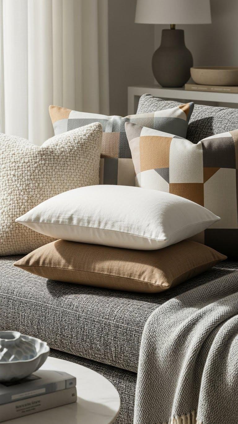 While bold patterns set the stage, layer textiles in complementary scales to add depth and tactile warmth without visual clutter. You’ll mix varying textures—soft boucle, crisp linen, low-pile wool—so each piece sings without competing. Keep a clear pattern scale hierarchy: large-scale anchors, medium accents, and fine-scale fillers. This approach feels modern and freeing, letting you curate a composed, personal living room.
