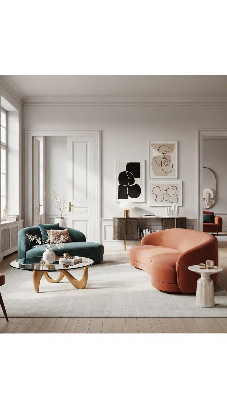 You’ll balance bold contours with airy accessories, pick luxe upholstery in a liberated palette, and keep sightlines open so the room feels elegant and free.