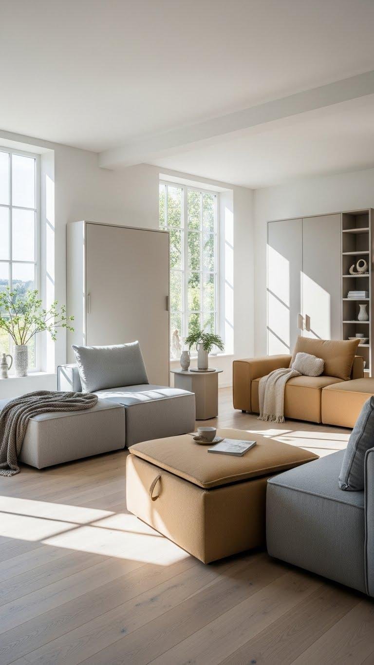 After you’ve given the room room to breathe with oversized, thoughtfully placed pieces, bring in multifunctional modular furniture to keep that openness flexible and practical. Choose clean-lined modules you can reconfigure, lean into space saving units that disappear when not needed, and add convertible ottomans for extra seating and storage. You’ll create a liberated, composed living area that adapts to how you live.