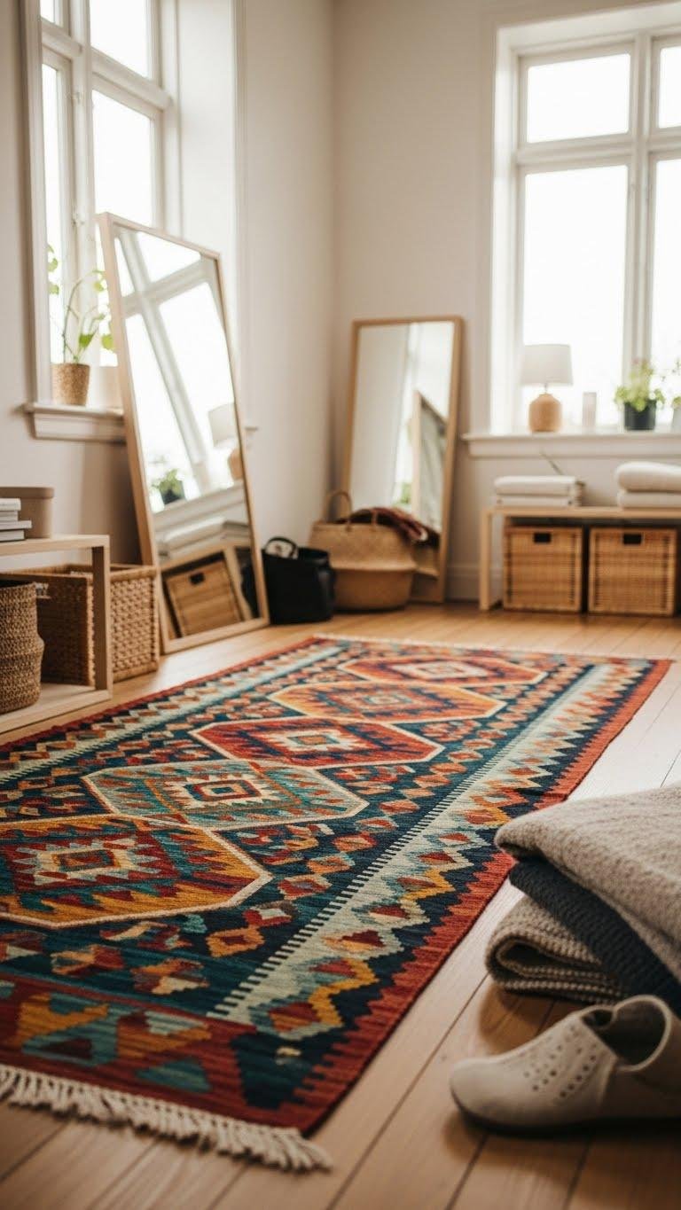 Mirrors widen the light and the view, but a bold patterned rug anchors the space and gives it personality underfoot. Choose a vibrant kilim or geometric runner to define flow, add color, and resist trends. You’ll layer texture, guide footsteps, and express freedom—pair with pared-back walls and breathable storage so the rug remains the visual hero without clutter stealing its voice.