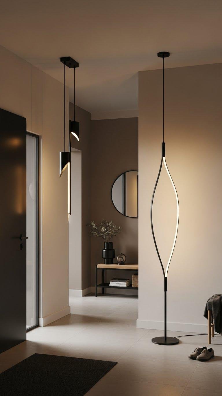 Anchor the entry with a sculptural floor lamp or pendant to add instant personality and purposeful light. Choose sculptural lighting that reflects your aesthetic — sleek metal, organic curves, or bold geometry — and position it to create vertical illumination that defines height and movement. You’ll free the space from clutter while making a confident, gallery-like welcome that feels open and unapologetically you.