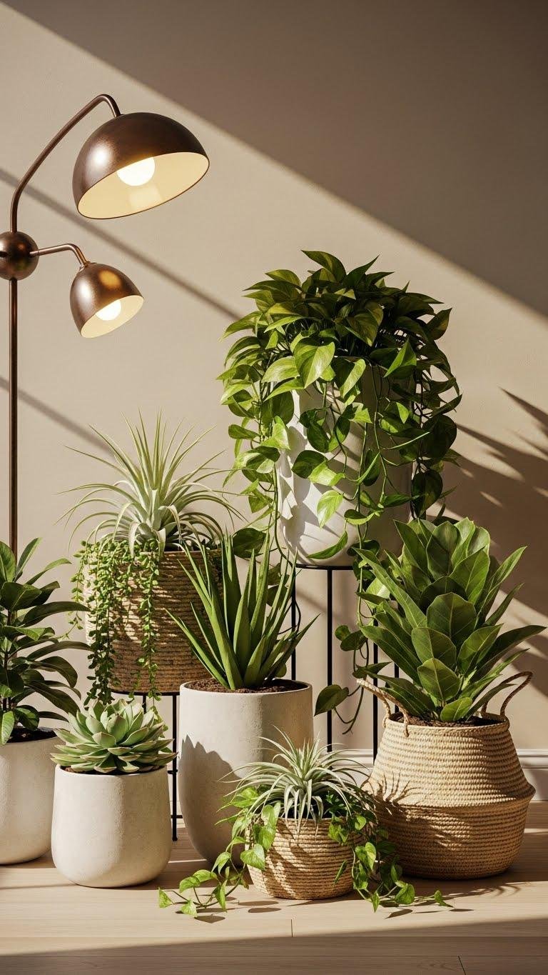 After the sculptural lamp sets the mood, bring life and texture with lush indoor greenery and potted plants that soften the gallery-like feel. You’ll mix air purifying succulents in ceramic planters with bold trailing pothos arrangements, layering heights and sculptural silhouettes.