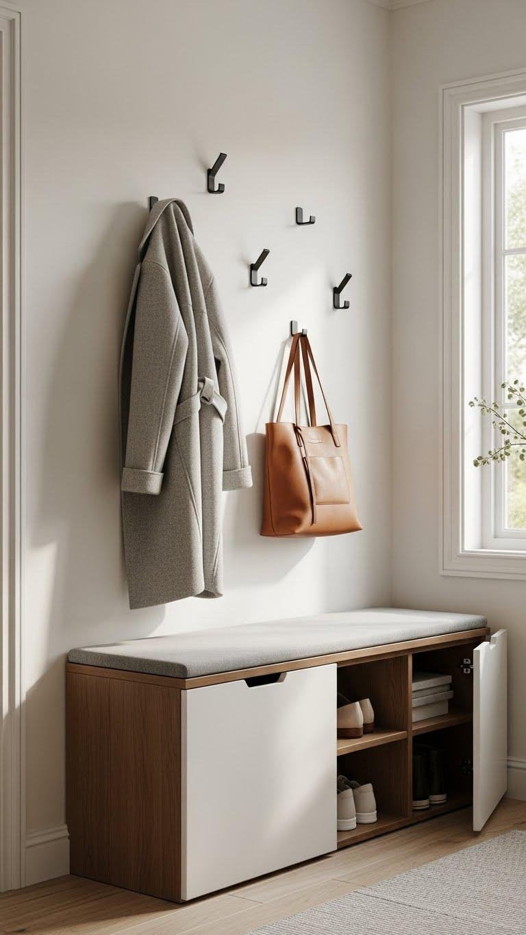 Create a tidy, stylish landing spot for coats by combining visible hooks with closed storage—so your entry looks curated, not cluttered. Hang minimal coat hooks at varied heights for jackets and bags, then tuck shoes and seasonal gear into concealed cubbies. You’ll keep surfaces clean, move freely, and maintain a sleek, modern vibe that welcomes guests while protecting your sense of calm.