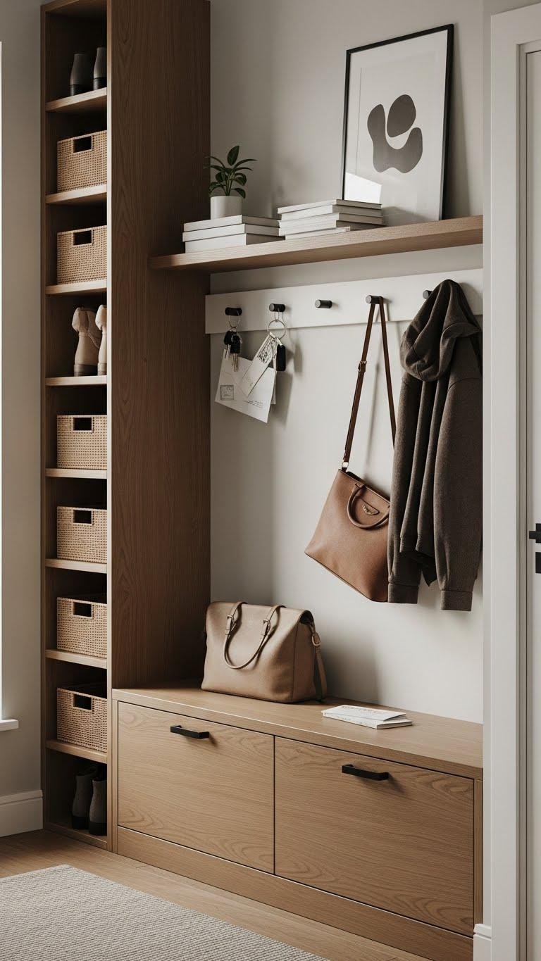 Create a compact multifunctional drop zone that works like a tiny command center — a slim bench with hidden storage, a narrow wall shelf for keys and mail, and a few hooks for bags and jackets — all arranged so every item has a purposeful place. You’ll embrace a compact command center aesthetic: vertical shoe cubbies, streamlined baskets, matte finishes, and clear sightlines that free your daily flow.