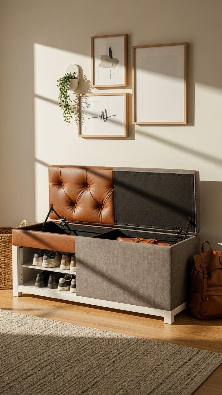 Pair your gallery wall with a storage bench that balances style and utility—upholstery softens the entry while hidden compartments keep clutter out of sight. Choose a tufted leather seat for luxe contrast or waterproof fabric for active households. You’ll want clean lines, roomy interior, and easy-access lids so you can grab gear and dash, keeping your entry calm, chic, and ready for adventure.