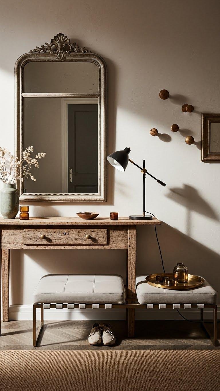 Pair a weathered console or mirror with minimal seating and a vintage modern lamp. Let negative space highlight textures; add a brass contrast via knobs or a tray. You’ll get a bold, free-spirited entry that feels lived-in and intentional.