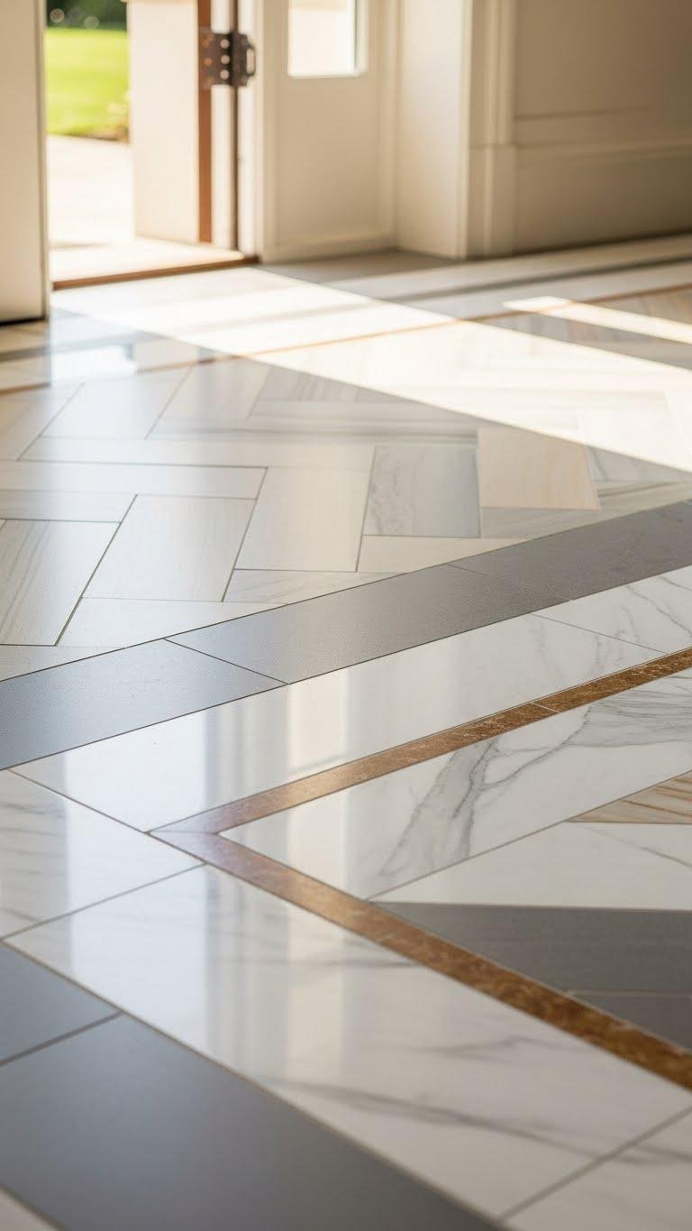 Lay down a herringbone or inlaid tile pattern to give your entry instant visual momentum and texture — it’s a small design move that reads high-end without feeling fussy. You’ll create a confident first impression with contrasting stone, marble inserts for luxe detail, and crisp geometric grout lines that emphasize shape. It’s a bold, freeing choice that anchors the space and invites movement.