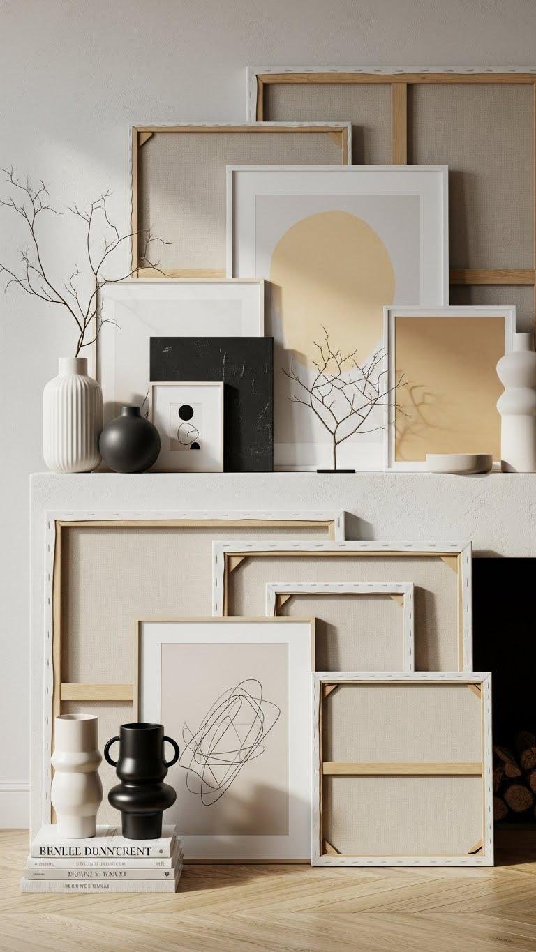 Framed prints and leaning canvases layered at different heights let you build a personalized focal wall that feels curated, not cluttered. Add sculptural accents—ceramic forms, metal branches—to introduce textural contrasts and dimensionality. You’ll balance pieces with generous negative space, letting each object breathe. Keep a restrained palette and varied scale so the mantel reads effortless, modern, and liberating.