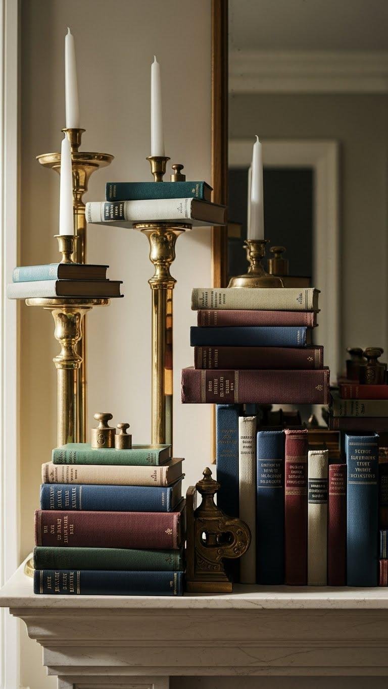 Layer stacked books onto tall candlestick holders to add height, texture, and an improvised sculptural feel to your mantel. You’ll mix layered spines and contrasting tones, anchoring stacks with vintage bookends or small brass weights. Keep arrangements asymmetrical, varying heights and thicknesses so each pile reads like art. This look feels liberated, curated, and effortlessly refined without fuss.