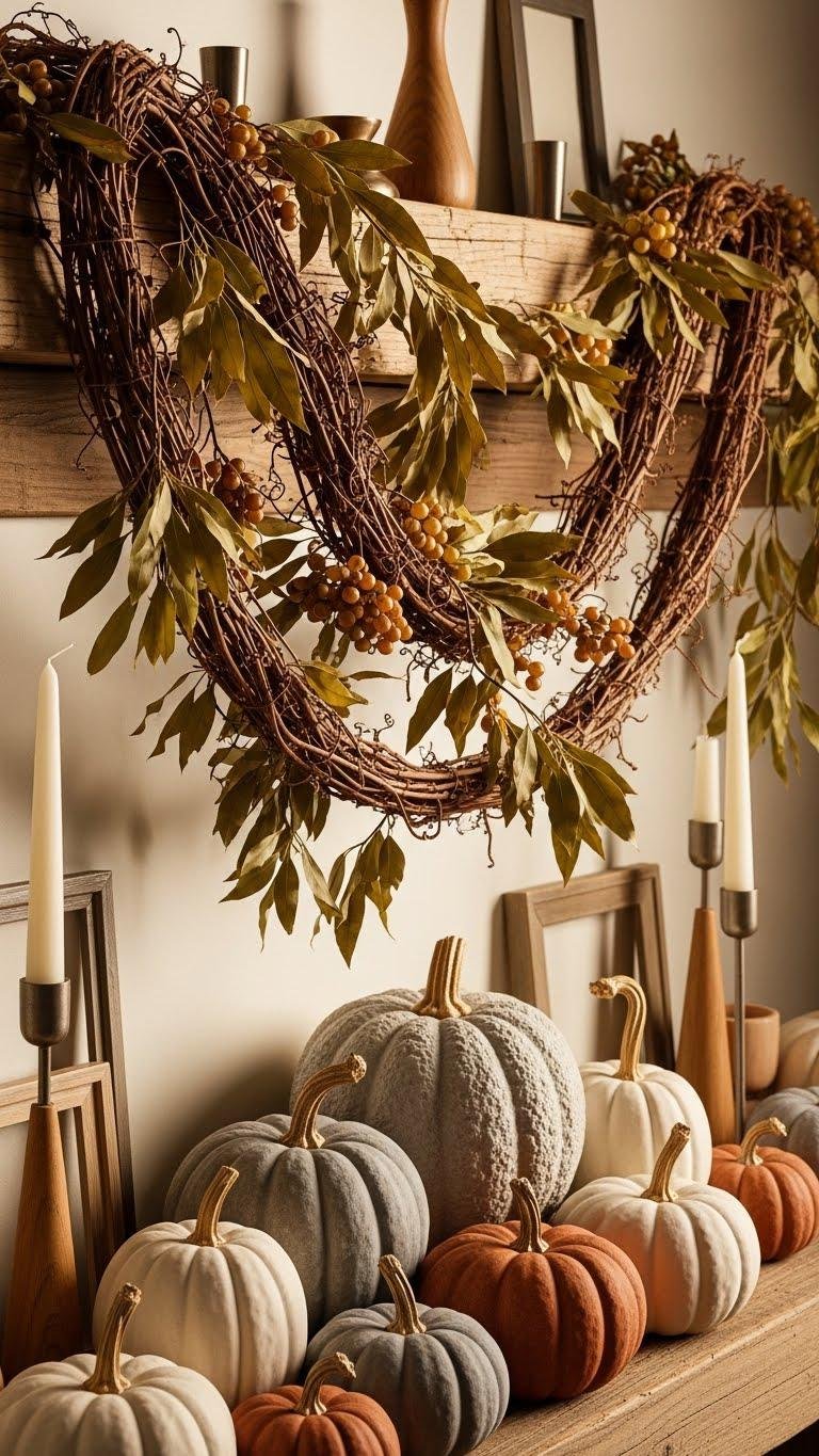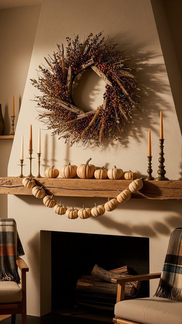 How do you make a mantel feel like the heart of your room this season? Hang an autumn wreath above a rustic mantel to anchor warmth and effortless style. Choose dried grasses, muted berries, and weathered wood accents that echo a pumpkin garland draped below. Layer minimal brass candleholders and folded plaid throws nearby so the space invites relaxation and freedom without fuss.