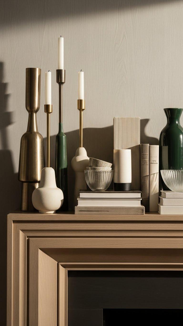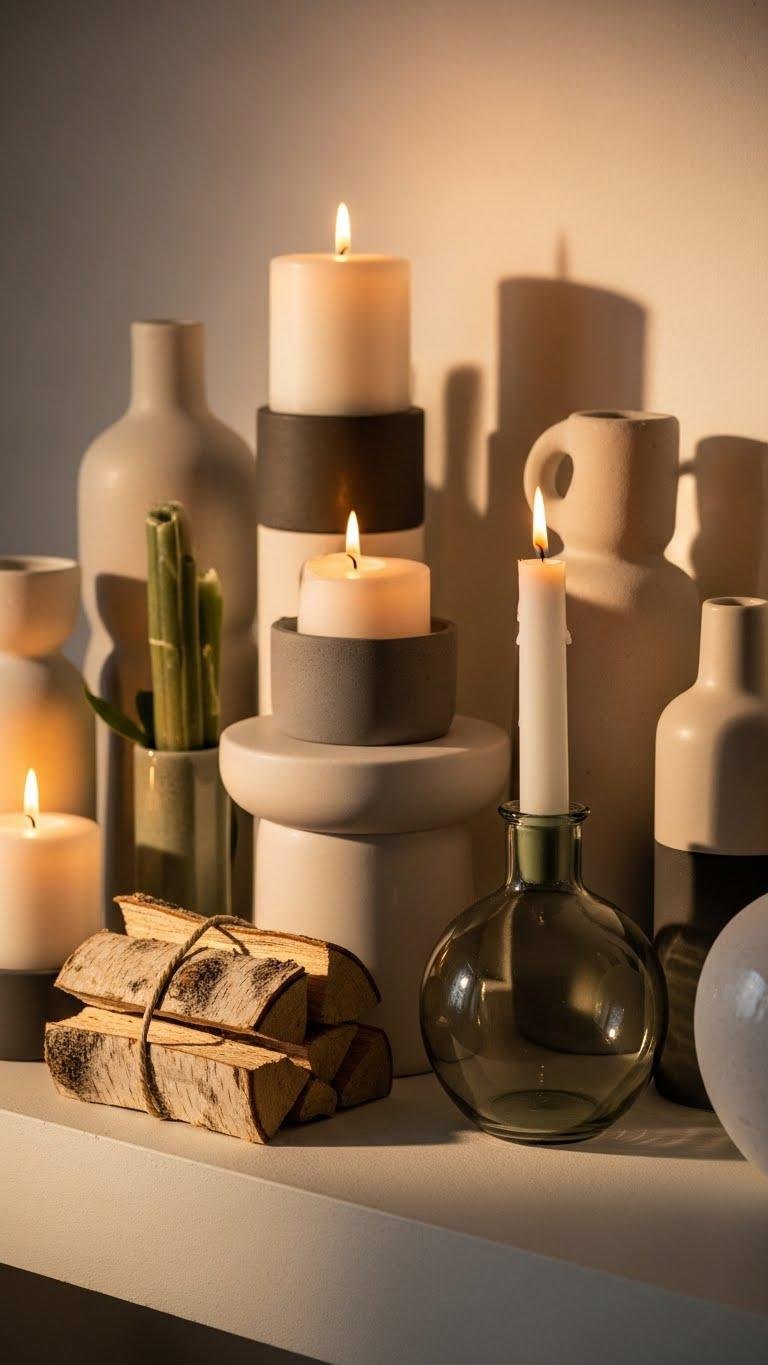 To soften the look from the previous vignette, swap in whitewash wood tapers paired with earth-toned accents to keep the warmth while lightening the visual weight. You’ll arrange whitewashed tapers in varied heights, nestling them among ochre, clay, and moss-hued objects. The mix feels effortless and free — restrained, tactile, and inviting, letting light and natural texture define your mantel.