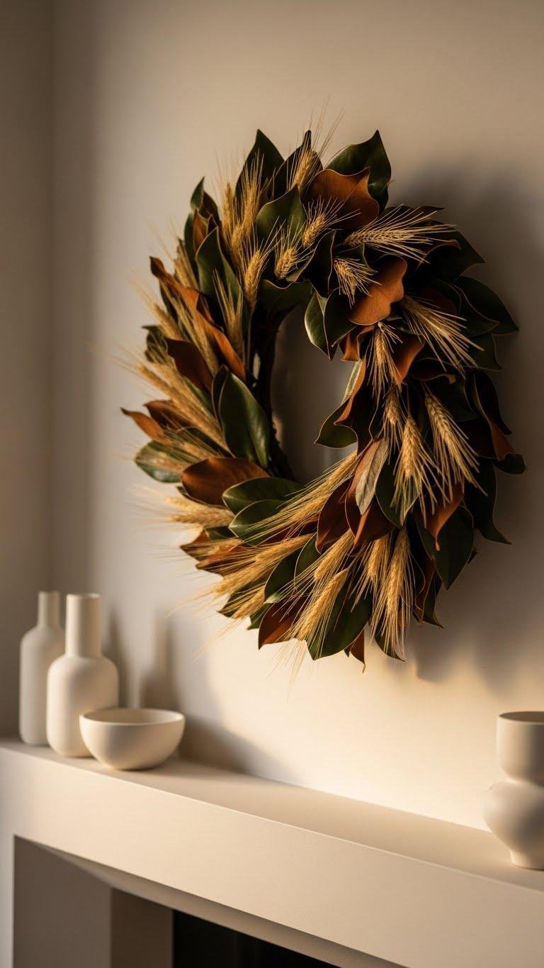 You’ll layer dried magnolia leaves with slender wheat wreath stems, favoring natural textures and a muted palette. Hang slightly off-center to feel effortless, modern, and freely expressive.