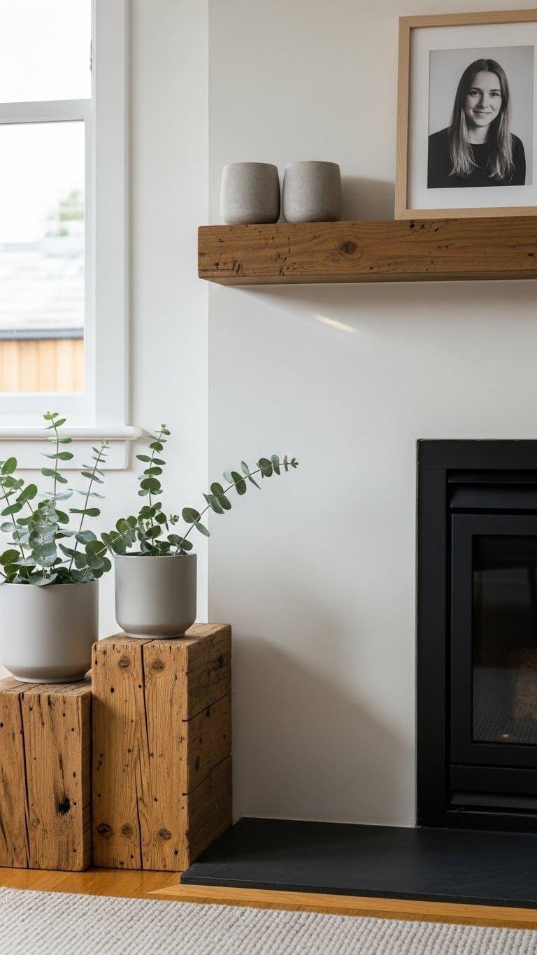After a personal portrait anchors the mantel, soften the scene by layering natural textures on the hearth: pair low-profile planters with warm, raw wood elements to create a cozy, grounded vignette. You’ll place potted eucalyptus in minimalist pots beside stacked reclaimed timber, letting scent and grain offer calm.