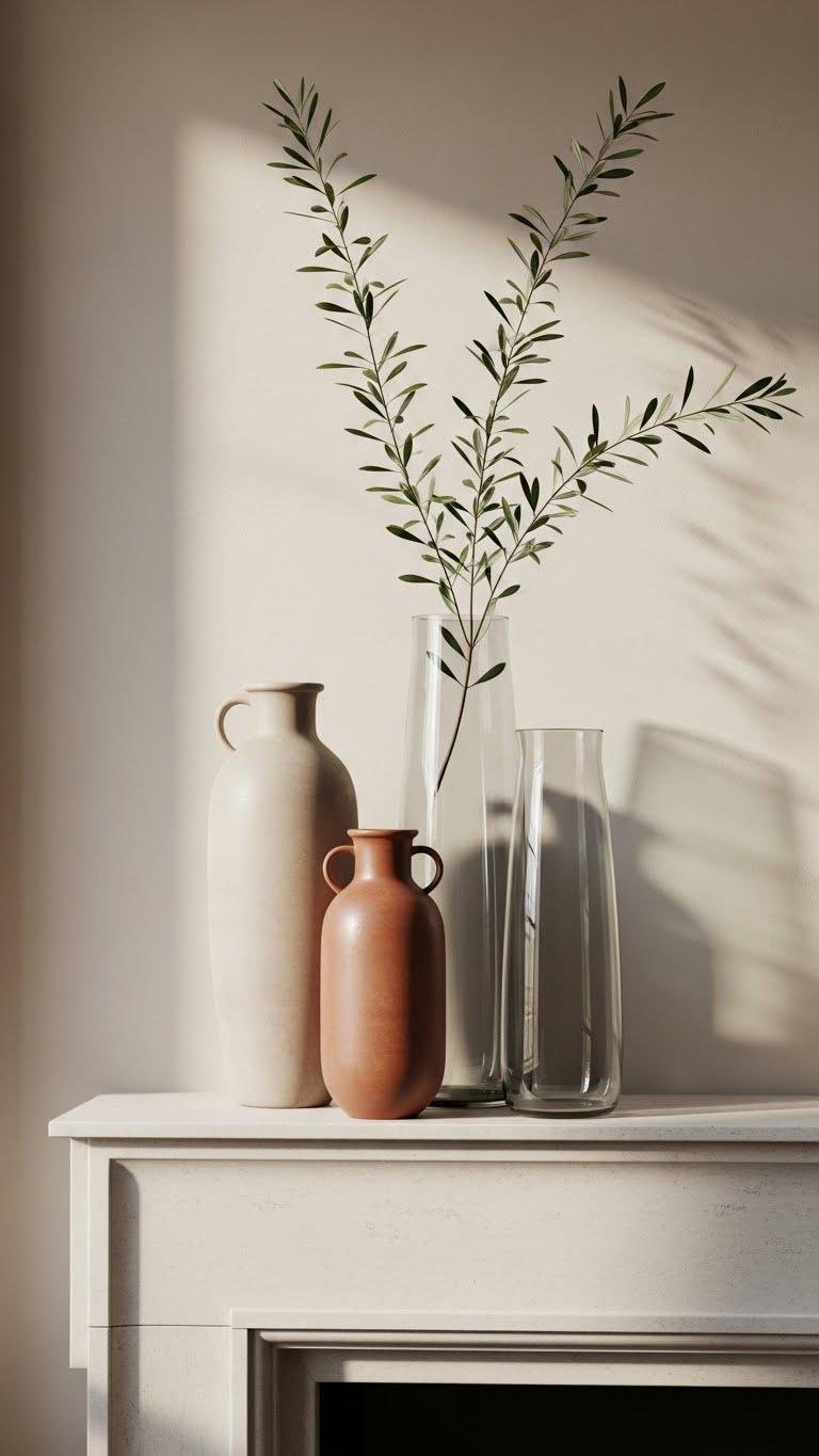 With a few tall vases and slender olive branches, you can add sculptural height and serene greenery to your mantel without overcrowding it.