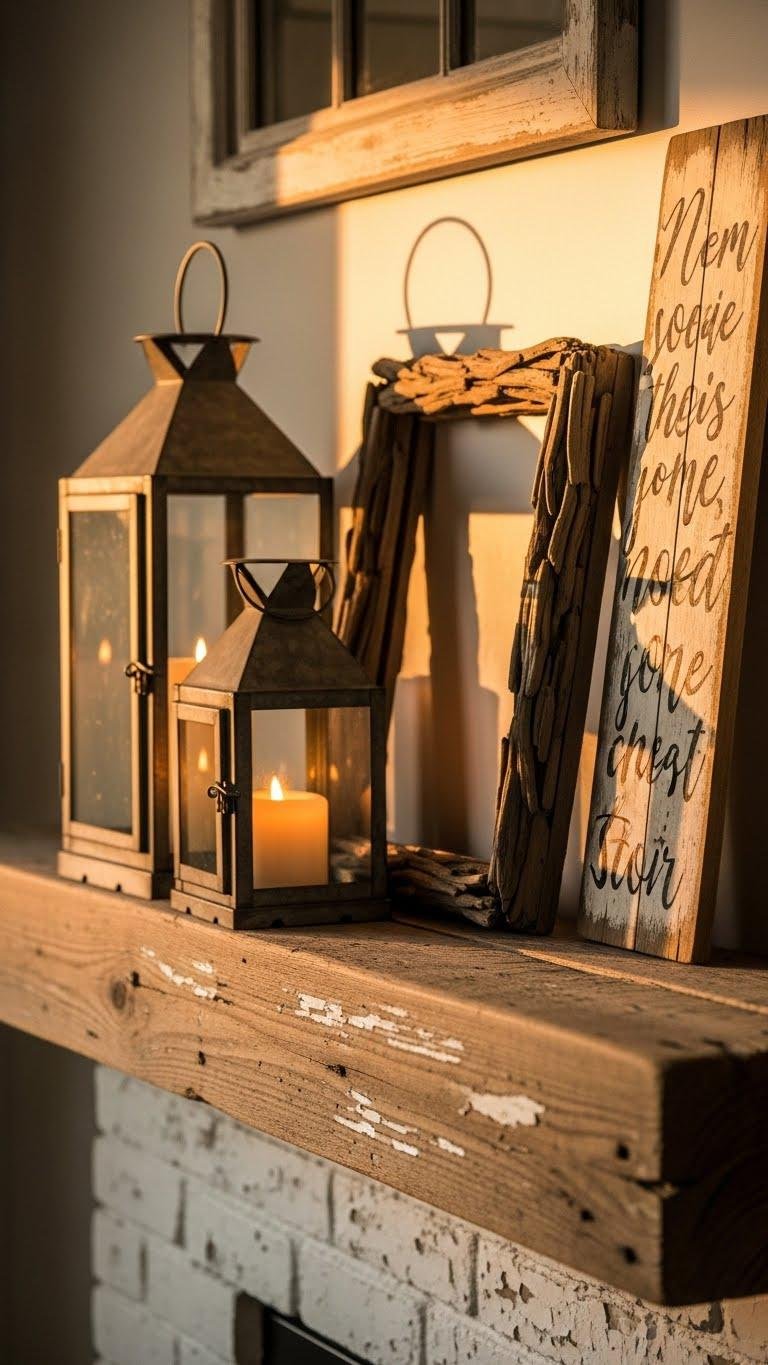 A pair of weathered lanterns and a hand-lettered wooden sign can instantly soften a mantel and lend it lived-in warmth; place lanterns of varying heights at one end and balance them with a rustic sign leaned or hung to create casual symmetry. You’ll layer texture with rustic lanterns, driftwood frames, and weathered signs, keeping styling effortless so your mantel feels open, personal, and free.