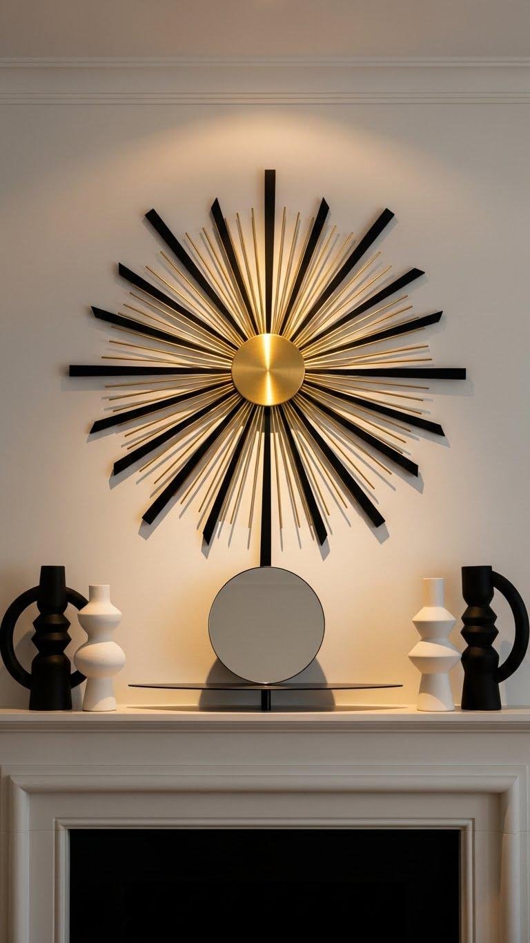 Start with a bold sunburst surround to lift the room’s energy and give your mantel an unmistakable focal point. Pair brass spokes radiating confidence with matte black accents to create contrast and attitude. You’ll balance scale with a low-profile mirror or a skinny shelf, then add two bold accessories for symmetry. Keep lines clean, colors limited, and let the statement piece breathe.