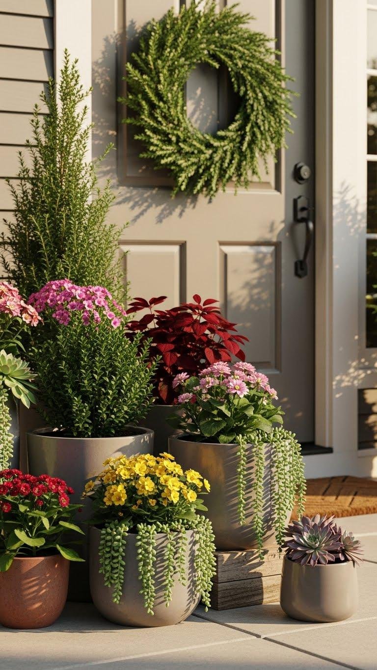 After a simple wreath sets the tone, cluster potted plants and containers to add texture, color, and a welcoming, lived-in feel to your entry. Mix dwarf evergreens for structure with seasonal blooms for pop, then soften edges using cascading succulents. Choose durable pots, vary heights, and leave room to move pieces—this keeps your doorway flexible, stylish, and effortlessly inviting.
