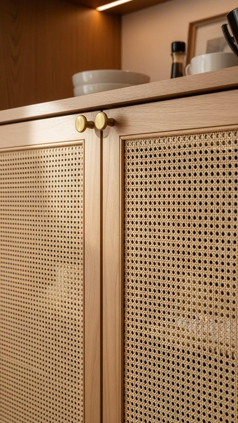 Swap solid cabinet fronts for woven or mesh inserts to introduce instant texture and breathability while keeping the silhouette clean.