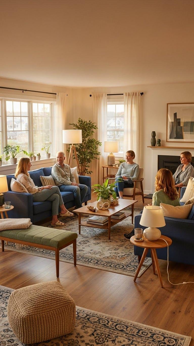 Set seating so people naturally face one another and conversations can flow—angle sofas and chairs toward a shared focal point, keep distances intimate (about 4–8 feet for small groups), and leave clear sightlines without forcing bodies to twist.