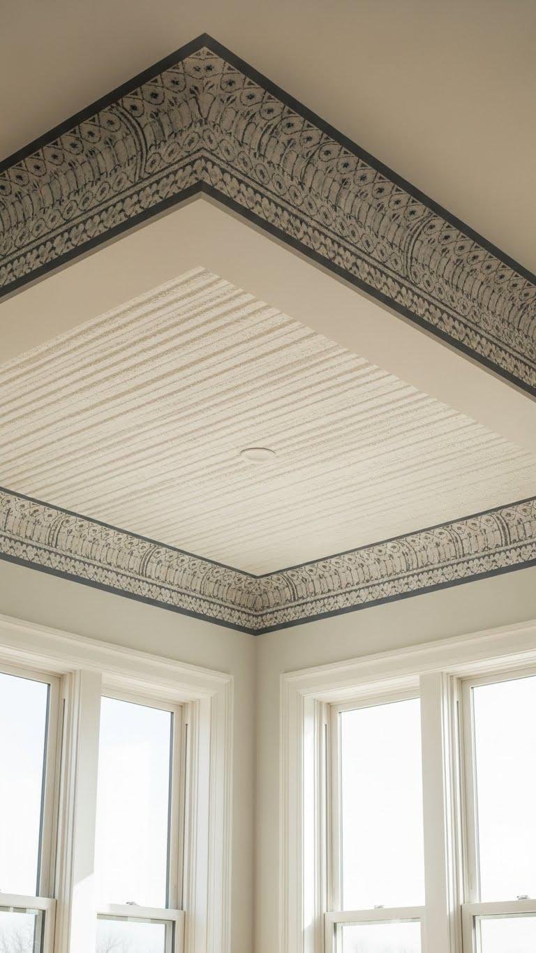 You’ll choose textured ceilings to sculpt light and shadow, or apply wallpapered crowns for patterned drama along edges. Keep scale balanced, colors liberating, and installation precise so the ceiling feels intentional, bold, and freeing.