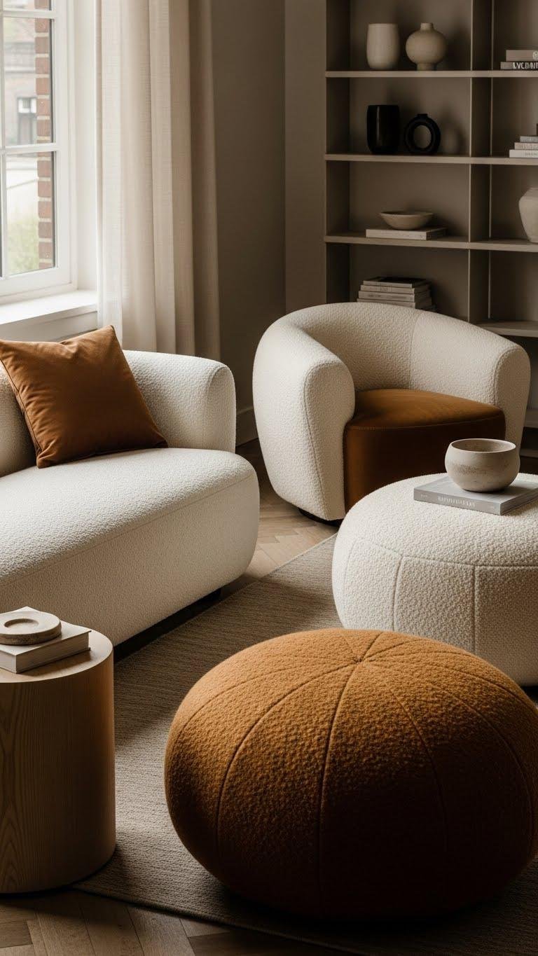 Often you’ll find that rounded, bulbous seating softens a room’s edges and invites lingering—think low, sculpted sofas, barrel chairs, and oversized poufs that read as furniture and art at once. You’ll choose bouffant ottomans and sculpted armchairs to create cozy clusters, balance angular shelving, and encourage relaxed conversation. Opt for tactile fabrics and restrained color to keep the effect liberated and deliberate.
