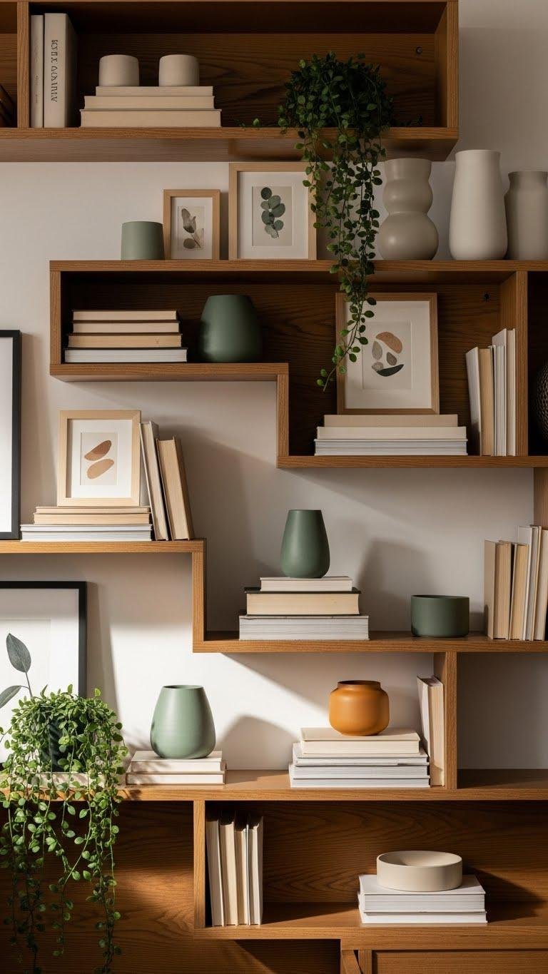 Layer shelving with intention to turn storage into a curated backdrop: mix heights, depths, and textures so your eye moves across layers instead of fixating on one plane.
