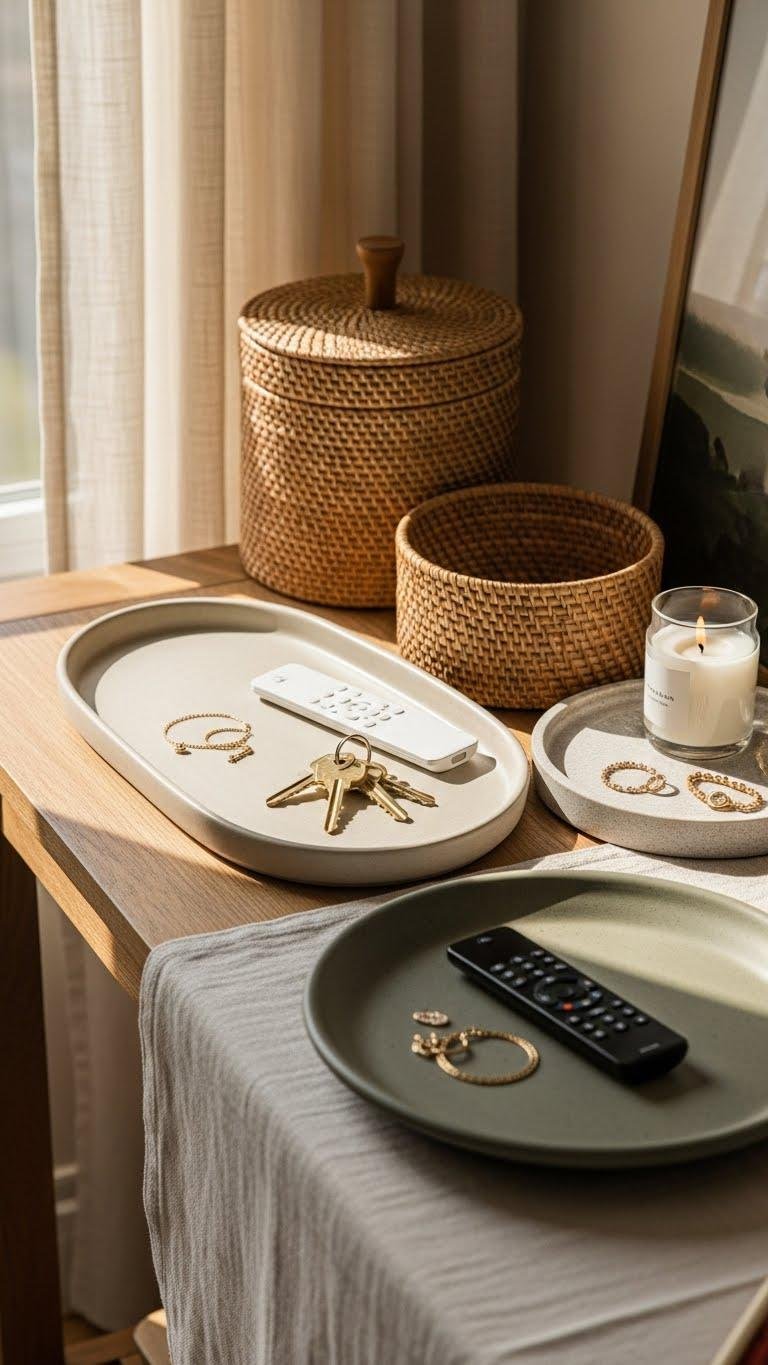 You’ll create calm and control by grouping keys, remotes, candles, and jewelry in decorative trays and woven baskets.