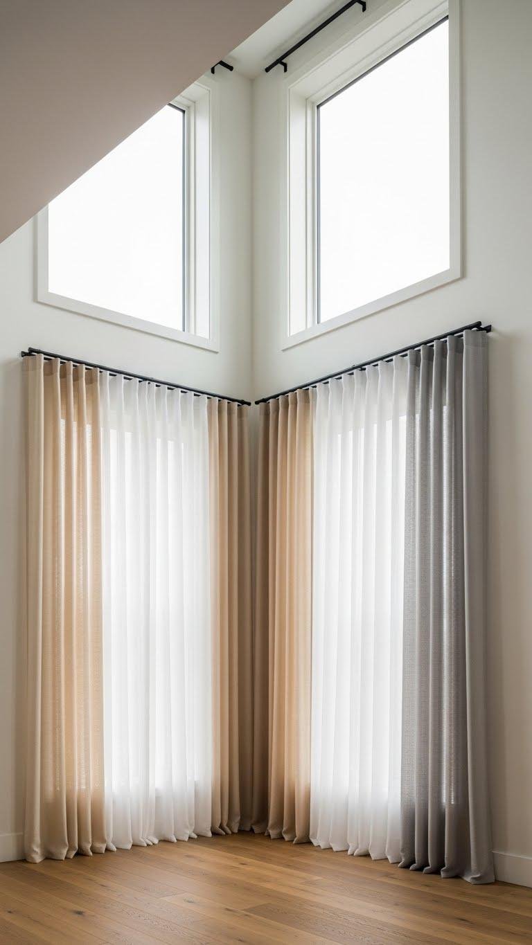 Layered surfaces naturally draw the eye upward, so extend that height play by hanging window treatments above the frame. You’ll create lofted proportions with high rod placement, making rooms feel freer and taller. Measure for proper fabric stack measurements so curtains puddle or clear the sill as you prefer. Keep lines clean, hardware minimal, and let light shape the space effortlessly.